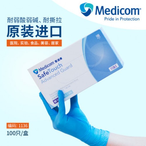 Medicom麦迪康 1136D加厚型一次性丁腈无粉轻薄实验室工业科研家务清洁手套蓝色 大号 100只/盒